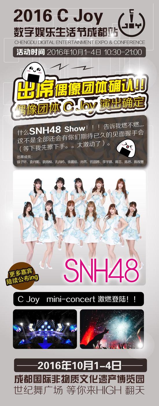 而此次C Joy数字娱乐生活节-成都站之行,SNH48女团也必将给各位倾力奉上高水准的精彩演出,将本次视听盛宴推上新一波高潮!