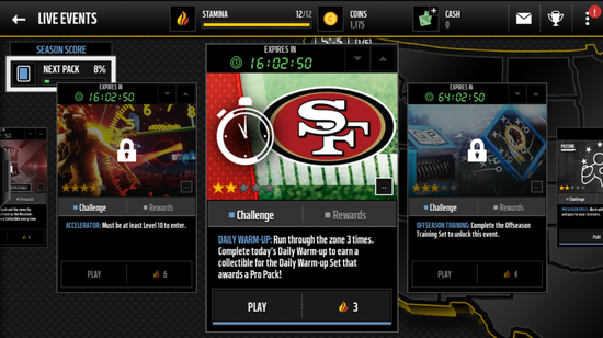 《NFL Mobile》在日常任务的设定上特别灵活。在这款游戏里,跟其他类似的模拟体育游戏一样,玩家需要募集不同的橄榄球队员集结成一支职业球队,然后在不同模式的赛事中角逐竞技。不同的模式带来了不同的游戏乐趣,同时也带来了不同的挑战和压力。而日常任务的出现则恰到好处。