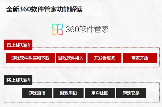 在功能上,360软件管家从游戏软件购买和下载、游戏软件接入、开发者服务、商家开放等功能做了进一步升级,以一站式游戏服务打通玩家与开发商之间的距离。后期360软件管家还会推出了以游戏直播、游戏周边、用户社区、游戏交易等为代表的多项全新功能,为国内游戏用户提供更加多样化的选择。