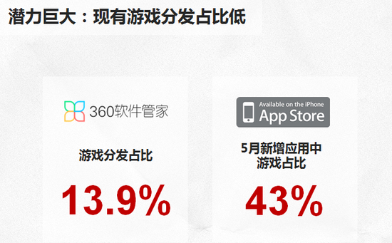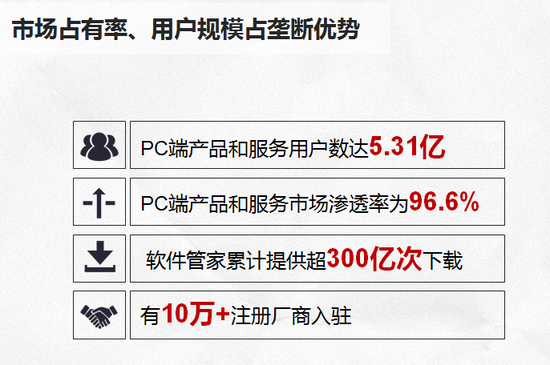 从360官方发布的数据来看,360 PC端产品和服务用户总数高达5.31亿,市场渗透率为96.6%,其中360软件管家已累计提供超300亿次下载,已有超过10万注册厂商入驻平台。庞大的用户和游戏厂商群体为360软件管家此次升级打下了坚实的基础。据360软件管家负责人李宜檑介绍,在国内下载平台普遍缺乏用户信赖、游戏娱乐成为PC应用重要方向的环境下,虽然游戏品类在软件管家中的占比仅为13.9%,但游戏分发仍具有巨大的潜力。