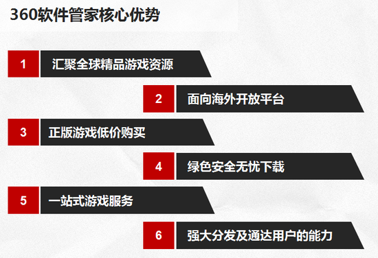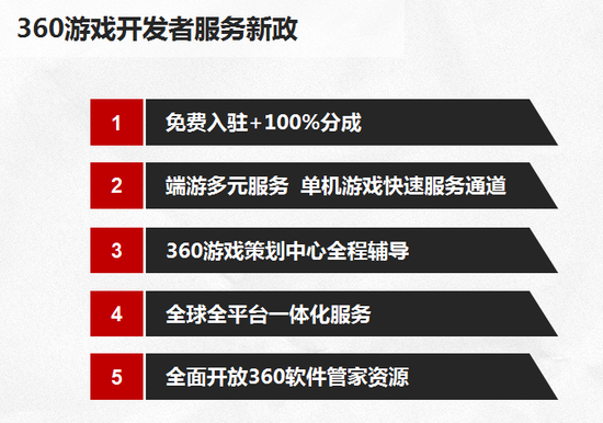 在政策上,360软件管家颁布了“免费入驻+100%分成”、“端游多元服务单机游戏快速服务通道”、“360游戏策划中心全程辅导”、“全球全平台一体化服务”、“全面开放360软件管家资源”五大游戏开发者政策,力求为PC游戏厂商和中小开发者提供更为便捷的服务和广阔的成长空间。
