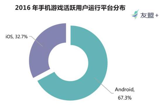 随着近几年移动平台的不断发展与淘汰,手机游戏主要运行平台也逐渐稳定下来:Android与iOS目前为手机游戏的主要运行平台,而在两个平台上活跃的用户群规模也逐渐稳定下来,其中iOS用户群占总活跃用户的32.7%,Android 用户占全部用户群的67.3%,份额变化幅度较去年变化不大。