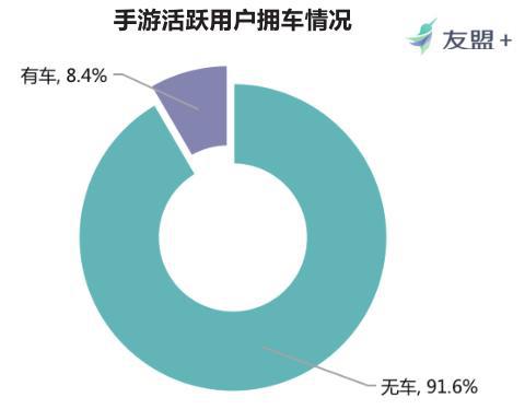 通过对手游用户用车情况进行分析,我们了解到:在全部手游活跃用户群中,约有8.4%的用户拥有车辆,拥车玩家在游戏的选择方面与其他玩家也略有不同,通过对拥车玩家的数据进行分析我们不难发现,卡牌、益智类相关游戏比较受拥车玩家欢迎。