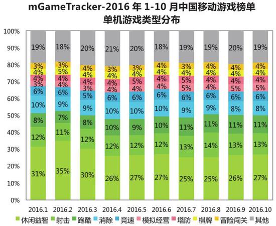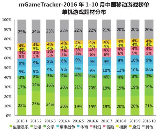 2016年中国移动单机游戏榜单相对固定,整体变化不大。由于单机游戏大多是休闲类游戏,因此搭配生活娱乐题材的最多。同时,动漫类的题材越来越受人们欢迎,这也与二次元文化在国内的传播和发展是分不开的。