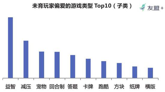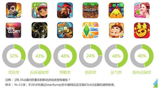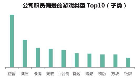 各类型之间差距不大,分布较为平均。其中以《我的世界》为代表的创造型游戏和以《虚荣》为代表的竞技型游戏,因为上手难度较大,用户喜爱度相对略低。