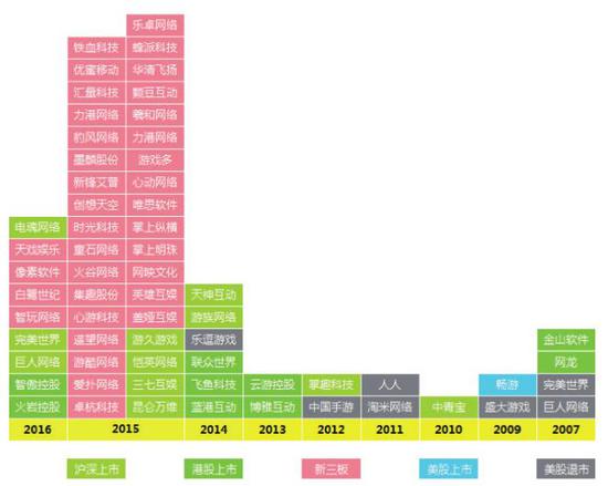 2015年,共有32家游戏相关公司挂牌新三板上市,超过之前15年上市游戏公司数量的总和。新三板由于上市门槛相对较低,成为中小企业上市的首选之地。其中绝大多数为与移动游戏相关的公司。2016年,巨人网络借壳世纪游轮,在退市一年之后获得A股上市批文,顺利成为第一个从纳斯达克退市回国上市的中概股。完美世界紧随其后,借壳完美环球,成功回归A股市场。