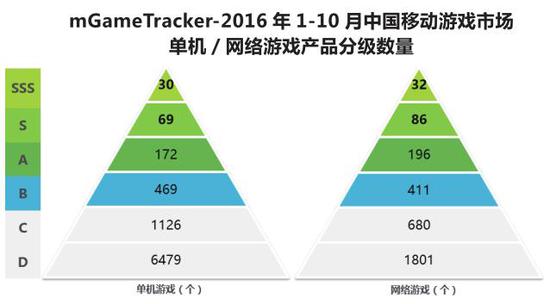 2016Q1到Q3上万款移动游戏产品中,72%为单机游戏,3000多款为网络游戏。单机游戏占比较去年有所下滑。其中,SSS级游戏共 30款,均为玩家所熟知的热门或经典游戏;此外,网络游戏的品质也更高,相较单机游戏而言,S级及A级的产品更多。