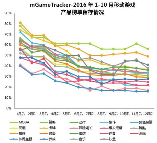 从产品榜单留存的情况来看,MOBA类的游戏长期留存率最高,棋牌类次之,而冒险闯关和休闲益智的游戏整体留存率较低。吸金能力最强角色扮演类的游戏在留存率上处于中间水平。