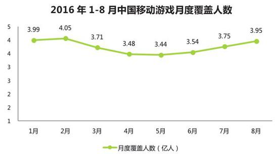 2016年中国移动游戏用户数量较为稳定,保持在4亿左右的月度覆盖。Q2用户覆盖有所下滑,主要是因为开学季,学生群体玩游戏时间变少。尽管人口增长红利已削弱,但用户的重度化将拉动用户ARPU升高,继续推动移动游戏市场增长。