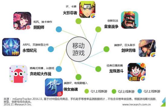 2016年上线新游中,有玩法创新、全球同服、专为移动电竞而生的《皇室战争》,也有经典日漫IP改编的《火影忍者》和《龙珠激斗》,有端游改编的《剑侠情缘》和《倩女幽魂》,还有《阴阳师》、《永恒纪元》、《贪吃蛇大作战》等在不同角度有所创新、制作精良的新游戏。这些新游一定程度上代表了2016年端游的三大特点:竞技化、重度化、精细化。