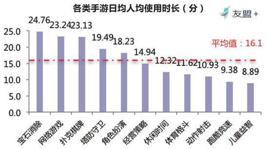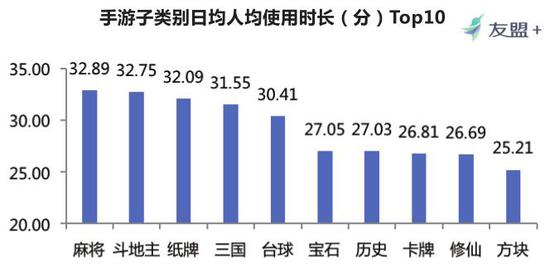 从大类别上来看,宝石消除类,网络游戏类,扑克棋牌等类别游戏每日消耗用户时间较多;从子类别中不难发现,麻将、斗地主、纸牌类游戏每日消耗用户时间长达半小时以上,属于用户驻留较久的游戏类型。