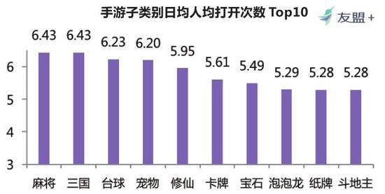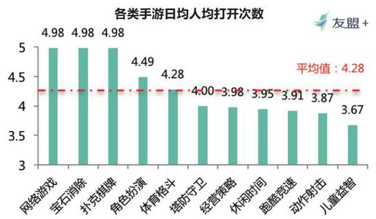 从用户打开行为方面来看:网络游戏类是用户日均人均打开次数最多的游戏类别,平均每日每人打开4.98 次,儿童益智类游戏每日打开次数最低;细分至手游子类别中不难发现,棋牌类,三国、修仙等题材类游戏用户每日打开频次较高。