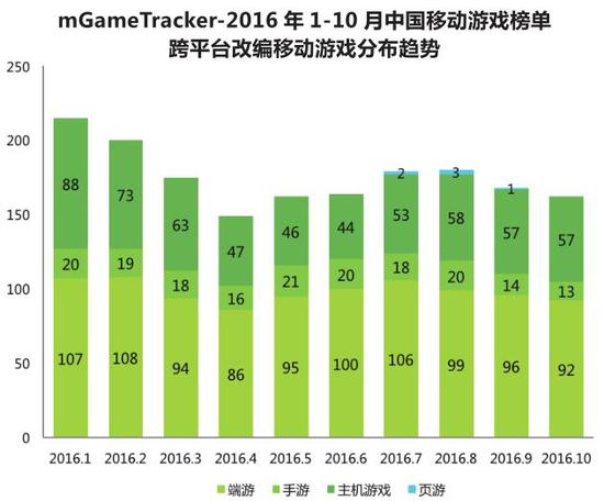 2016年跨平台改编游戏的分布趋势中,端游依然是最主要的手游IP来源,主机在年初有一个小高峰,之后呈下滑趋势,主要是因为主机游戏对硬件要求较高,适合在手机端移植的主机 IP 数量有限。另外,Q3还出现了几款页游改编的游戏。而 HTML5 技术的逐渐成熟,也为手机和 PC 端的跨屏页游提供很好的发展空间。