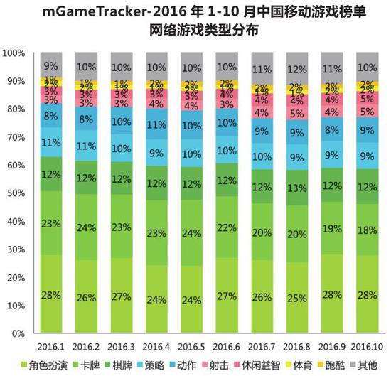2015年,以梦幻西游为首的角色扮演类游戏一路高歌猛进,引领了一股角色扮演类游戏的风潮。延续这一趋势,2016年角色扮演游戏依然是网络游戏类型占比中最大的一部分。卡牌类、策略类、动作类和射击类次之。而卡牌类游戏在Q1有个小高峰,之后占比逐渐下滑,一方面是因为卡牌的玩法相对固定,很难在设计上形成差异化竞争,玩家从一款卡牌转移到另一款卡牌能获得的新鲜感也有限,所以留给卡牌游戏的空间相对较小。