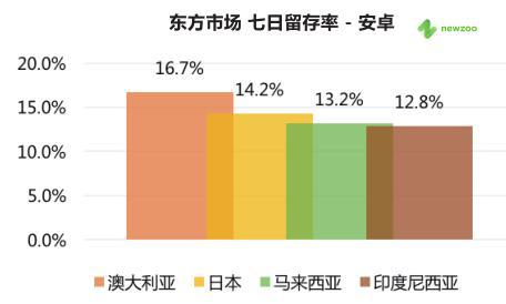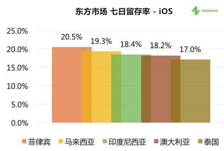 至于玩家留存率,东西方iOS玩家要比安卓玩家对游戏应用有着更高的忠诚度。在东方,澳大利亚的安卓留存率最高,而菲律宾的iOS玩家留存率最高。