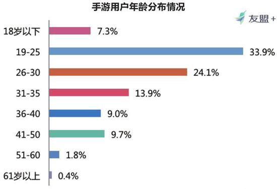 而从年龄层来看,手机活跃用户群仍主要集中于年轻用户群体:19~35岁的年轻用户是目前手游活跃用户的主力军,结合性别数据来看,男性用户在较为年轻的年龄层上占比较高,女性用户则在中年年龄段方面占比较高。