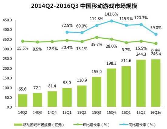 据报告显示 ,2016年全球移动游戏市场达到369亿美元,占全球游戏市场的37%。东方市场(亚太地区)的移动游戏收入将达到215亿美元,而西方市场(欧洲和北美洲)为123亿美元 。到2016Q3,中国移动游戏市场规模接近250亿,但增长率逐渐下滑。其原因主要是人口红利的用尽。移动游戏用户规模达到天花板,限制了移动游戏市场规模的增长。截止2019年,全球移动游戏将创造525亿美元,占总游戏市场的44%。