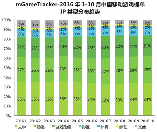 2016年中国移动网络游戏题材相对比较固定,没有大的波动。文学、动漫、魔幻、棋牌占了较大的比例。军事战争题材有小幅上升。2016年1-10月最具代表性移动游戏