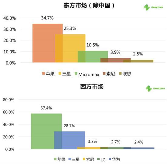 苹果是全球使用最广的手机品牌(中国除外),之后是三星。苹果在东方市场面临的竞争更激烈,包括本土品牌,如印度的Micromax。中国品牌也正在开拓西方消费者市场,华为是西方市场使用排名第5的手机品牌。
