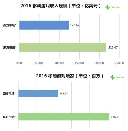 2016年,东方市场(亚太地区)的移动游戏收入将达到215亿美元,而西方市场(欧洲和北美洲)为123亿美元,过去几年西方的增长已经减缓。东方市场移动游戏占总市场的比例(45%)要远高于西方(27%)。东方市场将继续统治移动领域,2019年收入预计为 306亿美元,增长达到惊人的90亿美元。