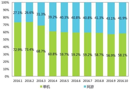 2016年单机游戏的数量占比呈现明显的下滑趋势,主要是因为4G网络的普及为游戏的联网性提供了有力保证。而网络游戏相比单机游戏更丰富的付费设计系统,让厂商能有更多的动力去设计网络游戏。甚至很多经典的单机游戏,如《捕鱼达人》和《保卫萝卜》也开始上线联网版的续作。