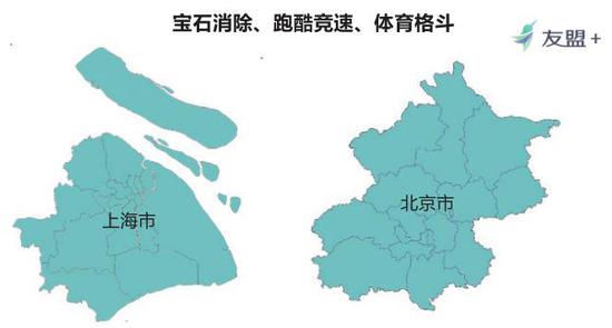 同样的,受限于地理、经济等多方面因素的影响,不同地区的移动用户对于手机游戏类型的倾向性也有不同的体现:上海、北京用户对宝石消除、跑酷竞速以及体育格斗类游戏的倾向性较高;