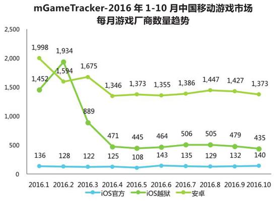 根据艾瑞mGameTracker数据整理发现,2016年10月中国移动游戏总数量达到11551款,厂商数量为5763个。其中安卓游戏和厂商数量远超过iOS第三方和App store市场。从季度数据上来看,2016Q1移动游戏的产品数量最多和厂商数量最多,但两者在3月之后都有明显回落。从渠道而言,iOS越狱渠道的数量变化较大,且从16年3月开始游戏数量及厂商数量均有较大下滑,而Android渠道的产品数量及厂商数量则呈现比较平稳的下滑趋势,iOS官方渠道的产品数量以及厂商数量最为稳定。在日渐激烈的移动游戏市场中,由于大厂霸榜,行业洗牌加剧,中小厂商面临更大生存挑战。随着版权保护的加强,和玩家付费意识的逐渐养成,越狱渠道的生存空间越来越小。