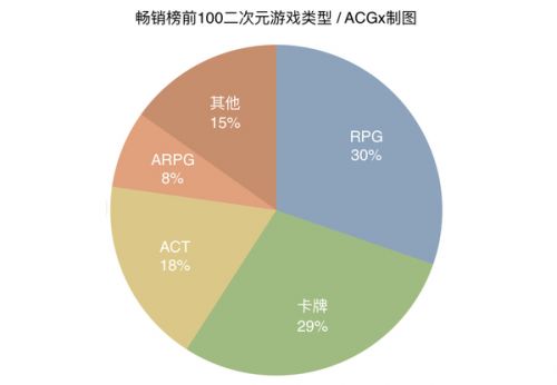 在游戏类型方面,这些游戏厂商推出的二次元手游产品目前仍然是以RPG、卡牌、ACT、ARPG这种类型为主。而在占比15%的“其他”类型中,则包含了女性向游戏、休闲益智、音乐、飞行射击、塔防这5类游戏类型。