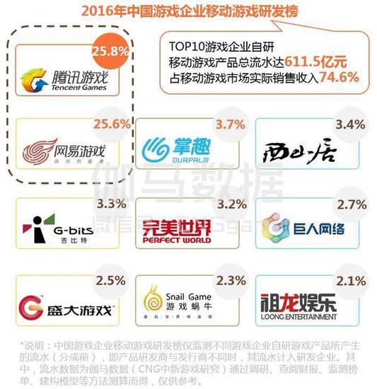 报告中“2016年中国游戏企业移动游戏研发榜 ”显示:腾讯+网易的自研手游总流水占手游市场销售总量的51%,Top 10游戏企业自研移动游戏产品总流水达到了611.5亿元,占到了总量的74.6%。