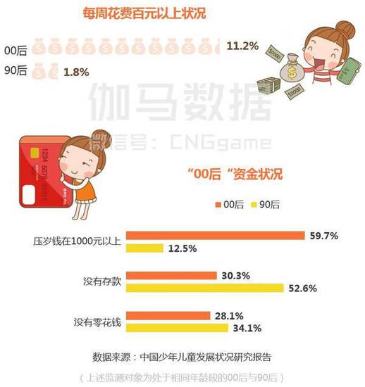 首先00后有较高的电子设备持有率和较强的付费能力。《中国少年儿童发展状况研究报告》显示:64.6%的00后拥有手机、29.1%的00后拥有电脑。此外,这一人群也有相对较强的消费意愿——从统计数据来看,每周消费的各档比例中00后均高于当年的90后。 00后的可支配的资金也更多,压岁钱在1000元以上的占到近60%,大幅高于90后; 23.4%的00后存款在5000元以上。这些都是成为移动游戏潜在付费用户的先决条件。