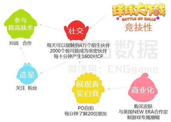 这种快速的用户积累建立在《球球大作战》的几个特性上:Q版萌系的造型对00后这一年龄层的玩家仍具备较强的吸引力;相对短的对局时长适合00后的游戏习惯。不同于传统休闲游戏,《球球》在游戏系统中强调了造星的内容,借助社交平台的推动,带动了00后追随游戏大神的积极性。