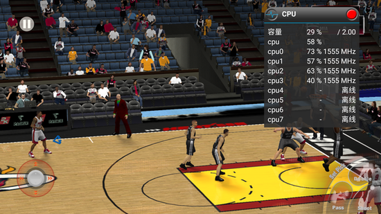 而当Helio X10的手机运行NBA 2K15时只开启了2个Cortex-A53内核,其余的6个并没有开启,(在启动游戏时曾有一段时间开启4个内核,但在真正游戏的大部分时间却只开启2个),此时游戏明显感觉卡顿,但休眠的核心显然不知道发生了什么。