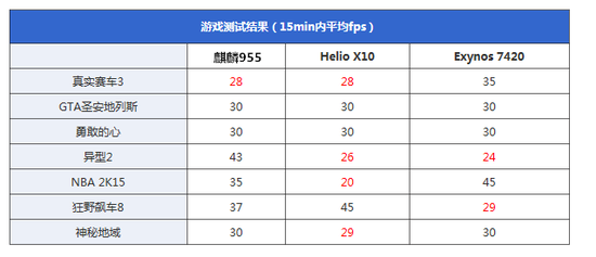 测试对象: 麒麟955处理器,联发科Helio X10处理器,三星Exynos 7420处理器。考虑到手机运存和内存的大小/频率,屏幕分辨率以及系统的优化都会综合影响游戏的表现。测试采用GameBench进行15min游戏后帧数的抓取,所得测试结果为15min内的平均帧数(fps),其中fps>30即可认为是流畅运行,游戏的流畅程度还跟最低帧数有密切关系。