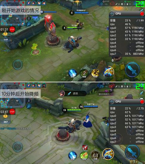 不过,游戏时间超过10分后,随着手机发热增加,处理器开始降频(小核全部休眠),“团战”的时候经常出现卡顿的情况。