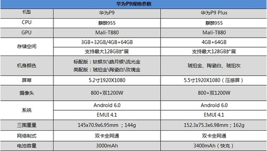 华为P9手机配备5.2英寸1080p屏幕,搭载麒麟955八核CPU,前置800万、后置双1200万像素摄像头,电池容量3000mAh,运行基于Android 6.0的EMUI 4.1系统。