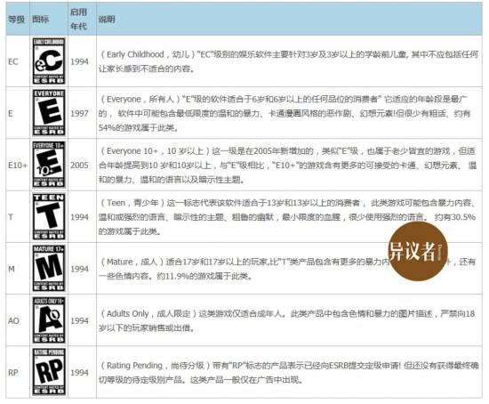 和中国不同的是,美国游戏产业在《真人快打》系列推出之后正式进入了政府监管的时代,也就是常说的“游戏分级”制度。美国采用的ESRB分级制度目前已经执行了23年,分为幼儿、所有人、10岁以上、青少年、成人、成人限定6个级别。代表这6个级别以及其下的30种分类描述,用一个个简单明了的字母为游戏提供了一个可信的保证。