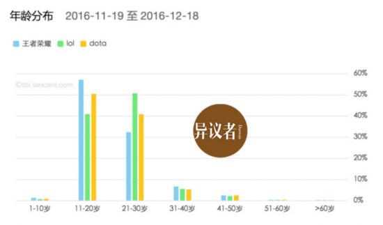 2016年12月,腾讯正式宣布《王者荣耀》的日活已达到5000万,是LOL月活的一半。而刚刚结束的农历春节中,其日活峰值已经达到了8000万。涌入《王者荣耀》的这批用户,大部分来源就是一二三线城市的中小学生。根据腾讯浏览指数发布的《王者荣耀》用户年龄分布,11-20岁的用户占《王者荣耀》将近60%,在此之后随着年龄段增长,每个年龄段用户数成倍数下降。