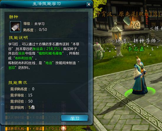 要种田先要学本领,在十方镇生活区域有很多高人指点仙侠们各种生活技能,想的到就能学的到,明码标价,童叟无欺。李石嘉老爷爷是耕种与地造技能的传道授业者,花费5两银子就能学习耕种技能,对所有人来说都是没有经济压力的。