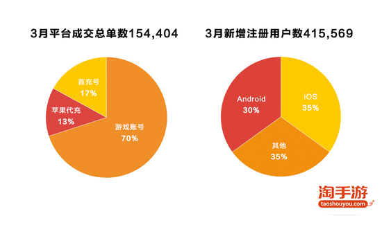 淘手游平台近日发布了2017年3月的平台交易数据。截至3月,淘手游平台累计注册用户达到300万人,3月共成交154404单,月流水破亿元,其中70%为二手游戏账号交易。
