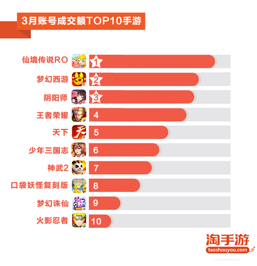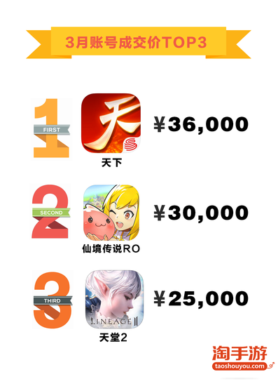 3月,淘手游平台成交价最高的一笔交易为《天下》手游账号,最终成交价高达36000元,《仙境传说RO》与《天堂2》手游账号以30000元和25000元的价格位居其后。其中,《仙境传说RO》手游同时进入平台成交额TOP10与单个账号成交价TOP3,体现了其玩家付费能力强且账号价值高。此前,校长王思聪也曾在淘手游平台以10万元的高价出售自己的极品RO账号。