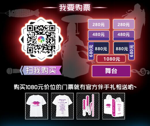 最后,本次购票还有特别的福利!购买VIP区1080元门票可获得官方限量纪念T恤1件+官方限量应援棒1根及礼品袋; 购买880元即可免费获得7月29日ChinaJoy门票1张!880套票,买2张880门票优惠价1560元(送2张29日CJ门票);