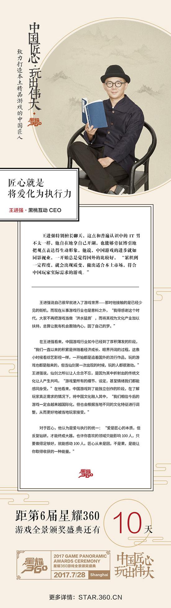 2017年,星耀360游戏全景颁奖盛典已经举办到第六届。为回顾中国游戏产业二十年来的发展历程,也为鼓励和嘉奖具有工匠精神与创新精神的中国游戏人,星耀360今年特别推出“致力打造本土精品游戏的中国匠人”主题活动,旨在感谢每一位以实际行动引领中国游戏产业发展进程的开拓者,以及以“匠心精神”坚守信仰,追逐梦想的中国本土游戏的守望者,感恩于这个让梦想和荣耀绽放的时代,为中国游戏行业树立更多优秀榜样,为中国游戏玩家奉献更多的精品。