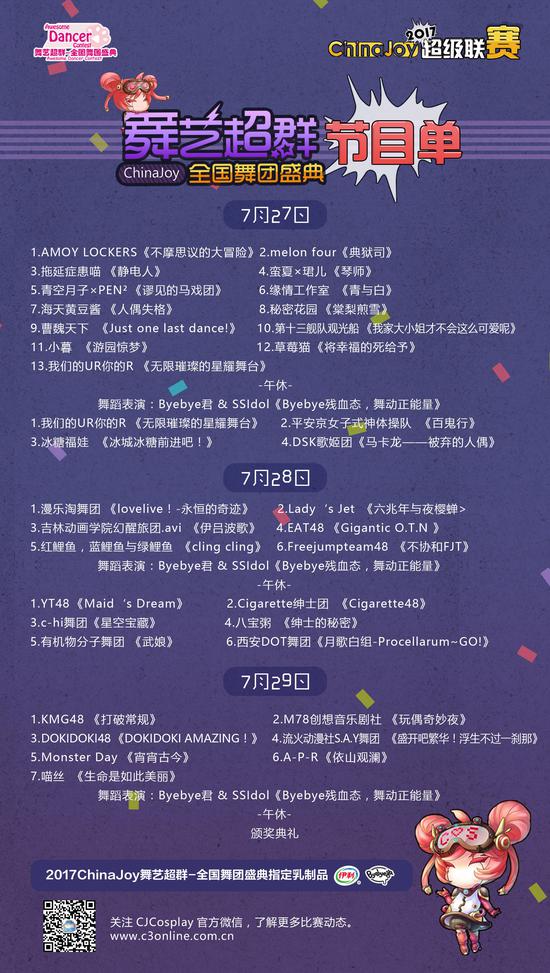 千呼万唤!2017 ChinaJoy超级联赛节目单公布啦!!今年比赛在全国一共开设十一大赛区,覆盖30余座城市。同时还与AcFun联手再次开设独家线上线上活动专区,以及专属“剑网3”题材的《剑网3》“江湖英雄令”活动!历经四个月的线上线下的层层比赛最终决出三十一支COS团队和三十六支舞团团队,晋级上海总决赛!