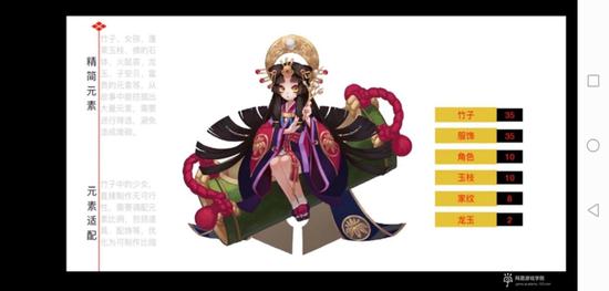 元素众多的情况下怎么去取舍呢?首先她是竹子中的一个女孩,竹子就是必要元素。然后就要体现富贵,在《阴阳师》里穿金戴银非常不合适,所以我们就去找以前日本贵族会用的传统元素,也就是十二单衣。另外就是辉夜姬对其中求婚者的要求中就包括了蓬莱玉枝和龙玉,这两个元素都比较适合她,除了能起到装饰的作用以外,也比较符合她富贵的形象。所以选了这两个元素去拼装。