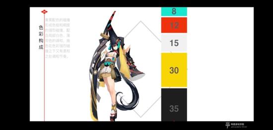 我们在画的时候,黑色和白色其实不算颜色,所以黑色和白色的面积比较大,再加上一点黄色。这角色在视觉上就是以黄色为主调的,里面再加上一些反色,比如说色环上比较接近的红色,和完全对立的绿色。通过加入这些颜色,在整体的统一里寻找些细微的节奏感来调节角色。