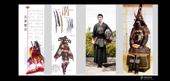 妖刀姬的元素没有很多,就是刀跟女孩子,确定了第一个元素之后,怎么去拓展?武士刀,很自然会联想到武士盔甲。武士盔甲其实也是很普通的一个元素。要怎么去做出不普通?就是找历史上的一些名人。