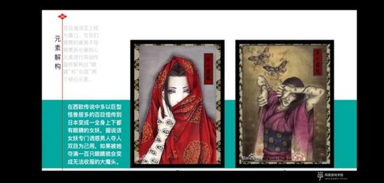看这个图就知道这个角色其实跟《阴阳师》的唯美和风匹配不上。那怎么办?我们就要去进行元素解构。我们看这两张图,他们的共同元素,一个是眼睛,第二个就是女性,这两个解构出来的元素,其实就是最核心的设计元素。