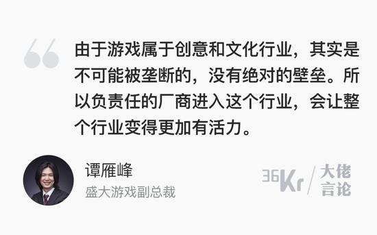 但是由于游戏属于创意和文化行业,其实是不可能被垄断的,没有绝对的壁垒。所以负责任的厂商进入这个行业,会让整个行业变得更加有活力。