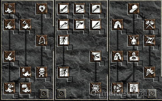 《暗黑破坏神2》野蛮人的技能树,这款游戏中主动技能基本是完全依赖于技能树获得的,因此也是主动技能与被动技能混杂其中的