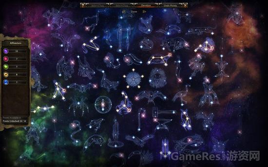 游戏中虽然只有一种token,但是加给不同的点会被记做不同的颜色,看左侧会发现一共有5种颜色。然后看中间的各个星座,每个星座都是只能从一头往另外一头加的,全部加满后会解锁额外特效。每个星座都需要满足一定数量的颜色组合的情况下才能开始加点。整套东西的学习成本极高,和POE不相上下。